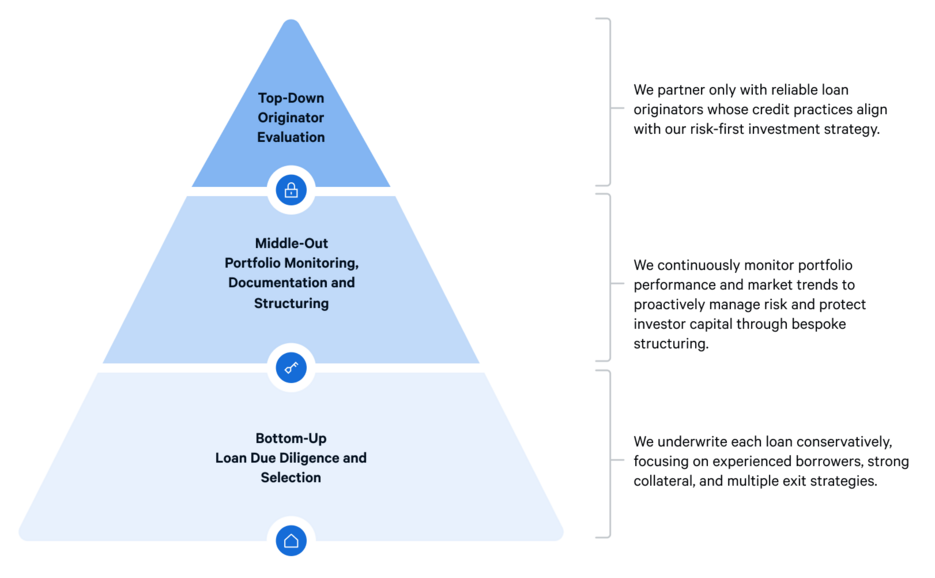 We begin with a top-down evaluation of each loan originator. This includes reviewing their track record, management team, financial stability, underwriting guidelines, and market reputation. We assess how loans are sourced, structured, and serviced to determine whether the originator’s credit philosophy aligns with our investment criteria.